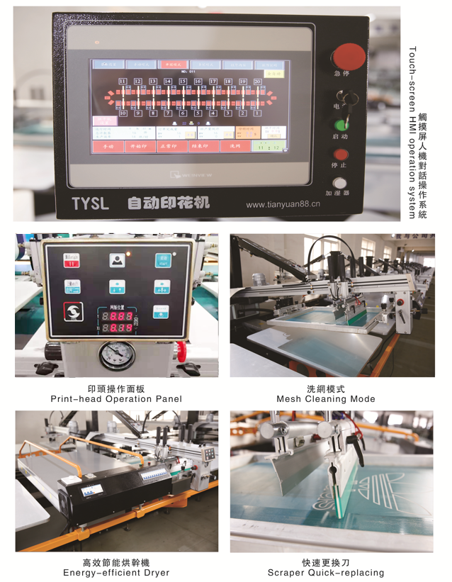 產品特點:TYSL系列自動印花機以其先進的設計、巧妙的結構、精密的對版、穩定的運行、便捷的操作和對各種印花材料的適應性,加上貼心、周到、及時的售後服務,一舉超越當前所有的自動印花設備,成為印花行業轉型升級的有力助手。